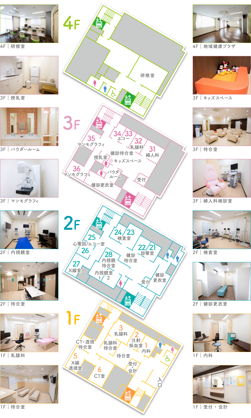 みぎたクリニックは、健診部門に、新たに保険診療部門(乳腺科、内科)を兼ね備えたクリニックです。部門別の専用フロアを有し、右田健診クリニックの良さをそのまま引き継いだ、女性専用フロア(3F)、男性もご利用いただける健診フロア(2F)、診療フロア(1F)に分かれます。胃内視鏡、胃透視、CT、腹部エコー、各種健診機器を新規導入し、特定健診、企業健診、人間ドック等の充実した健康管理部門となりました。最上階(4F)には音響設備を完備したフォーラムを有し、健康教室等のイベントが催せる地域健康プラザとして、地域の皆さまが集えるコミュニティーづくりを目指します。